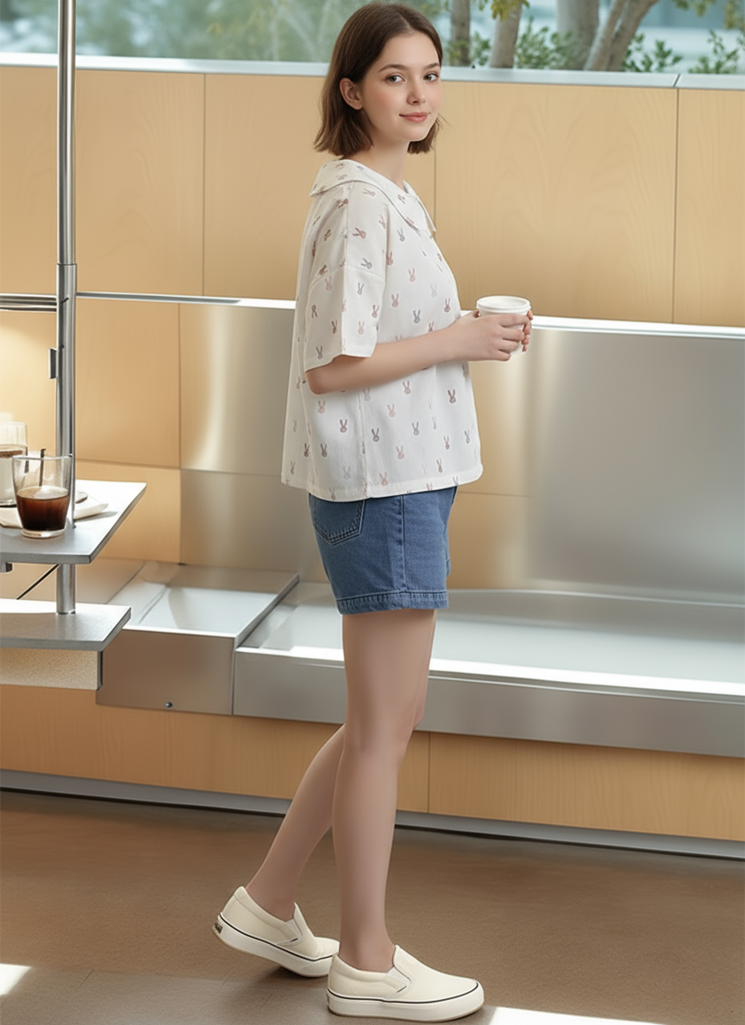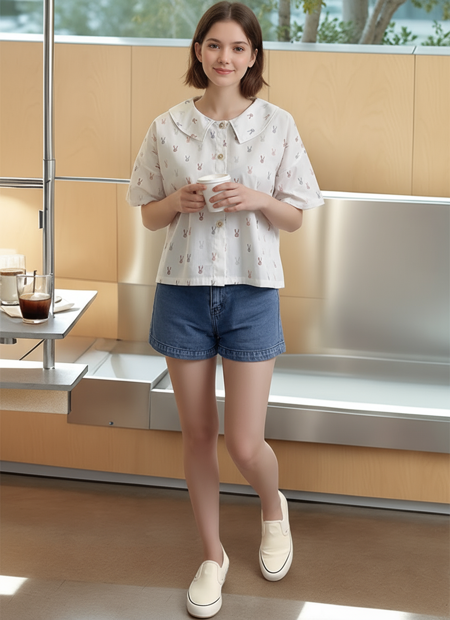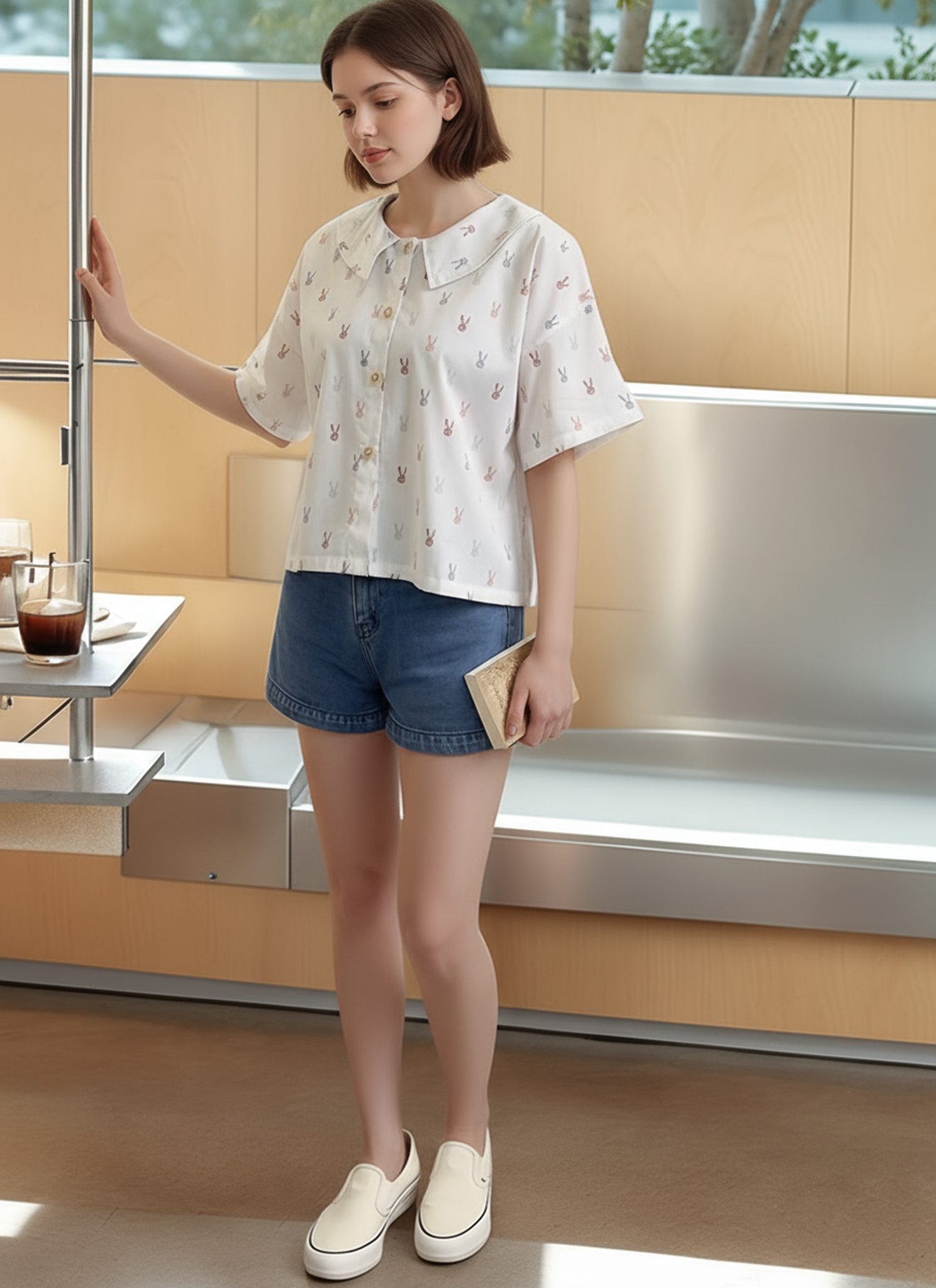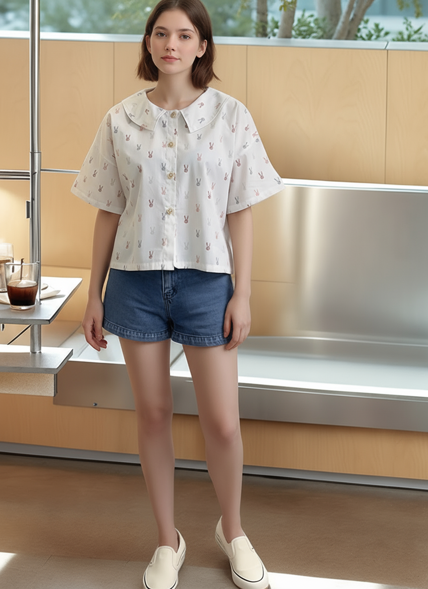 เสื้อเชิ้ตคอตตอนทอทแยงพิมพ์ลาย Bunny Garden