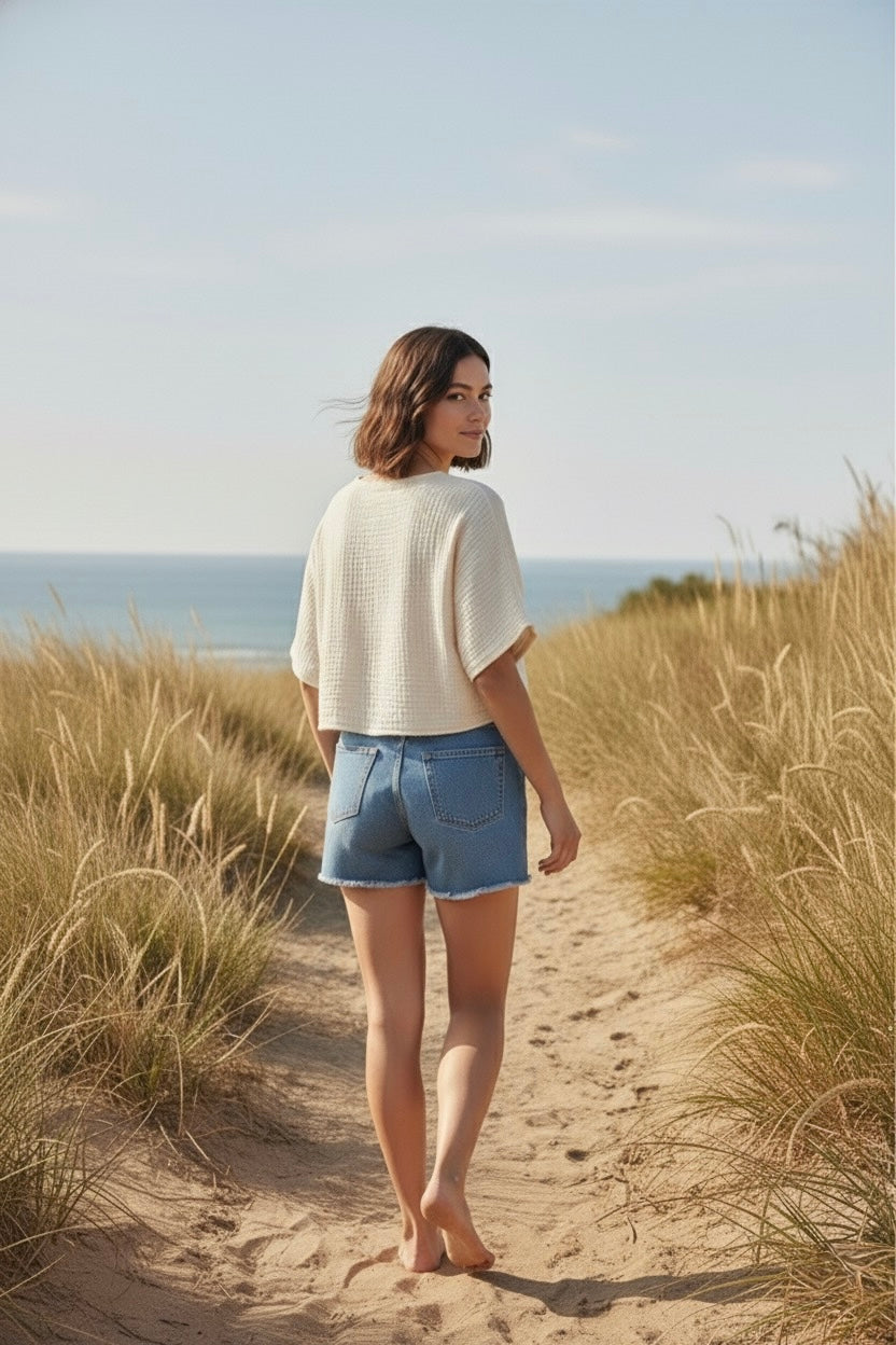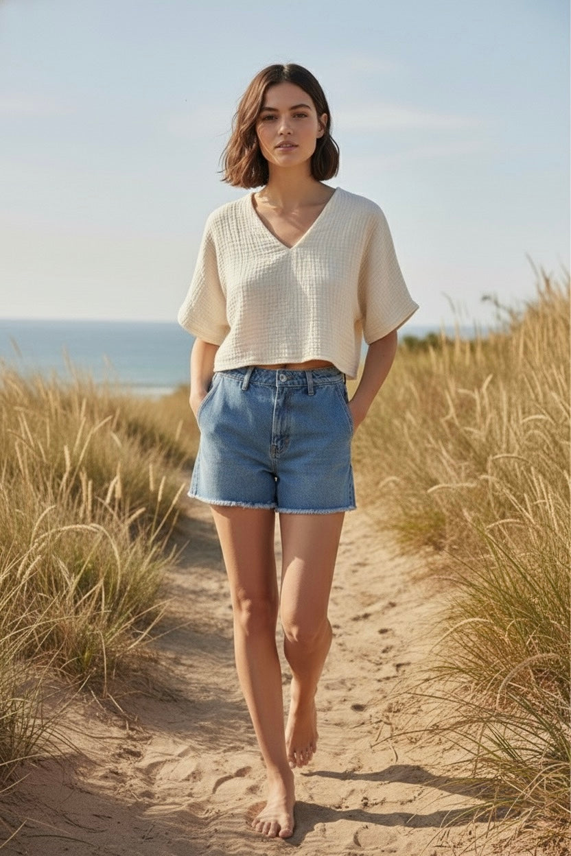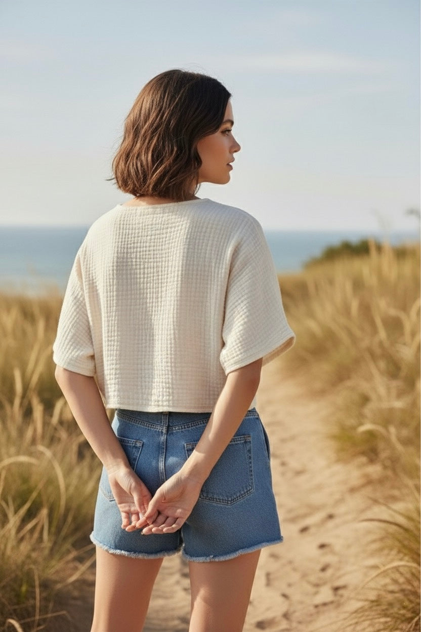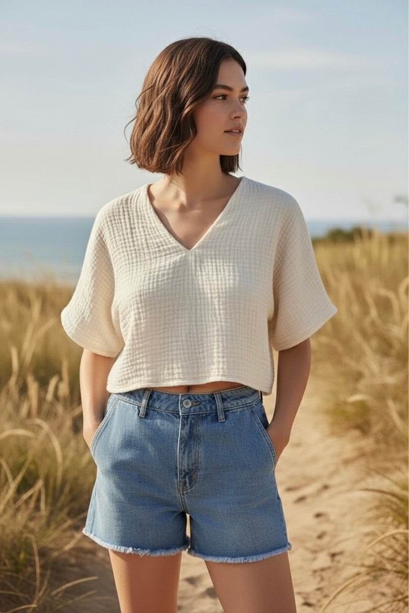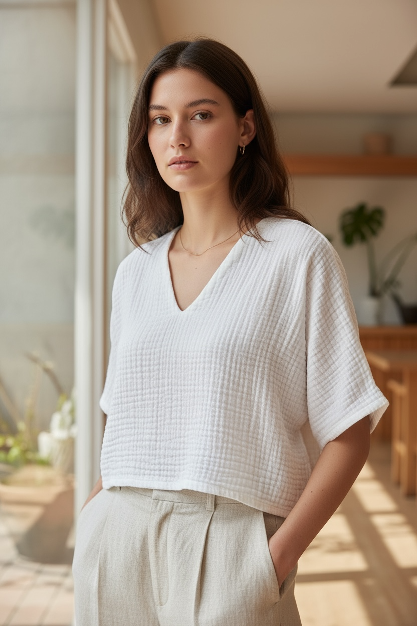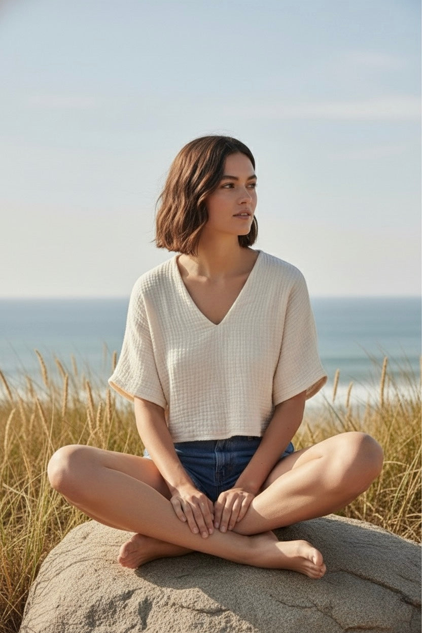 - ดีไซน์ทรงครอปคอวี แขนสั้นทรงกว้าง ให้ลุคเรียบสะอาดแบบมินิมัล - เหมาะกับทุกโอกาส ตั้งแต่ทำงานที่บ้าน คาเฟ่ หรือเดินเล่นริมทะเล