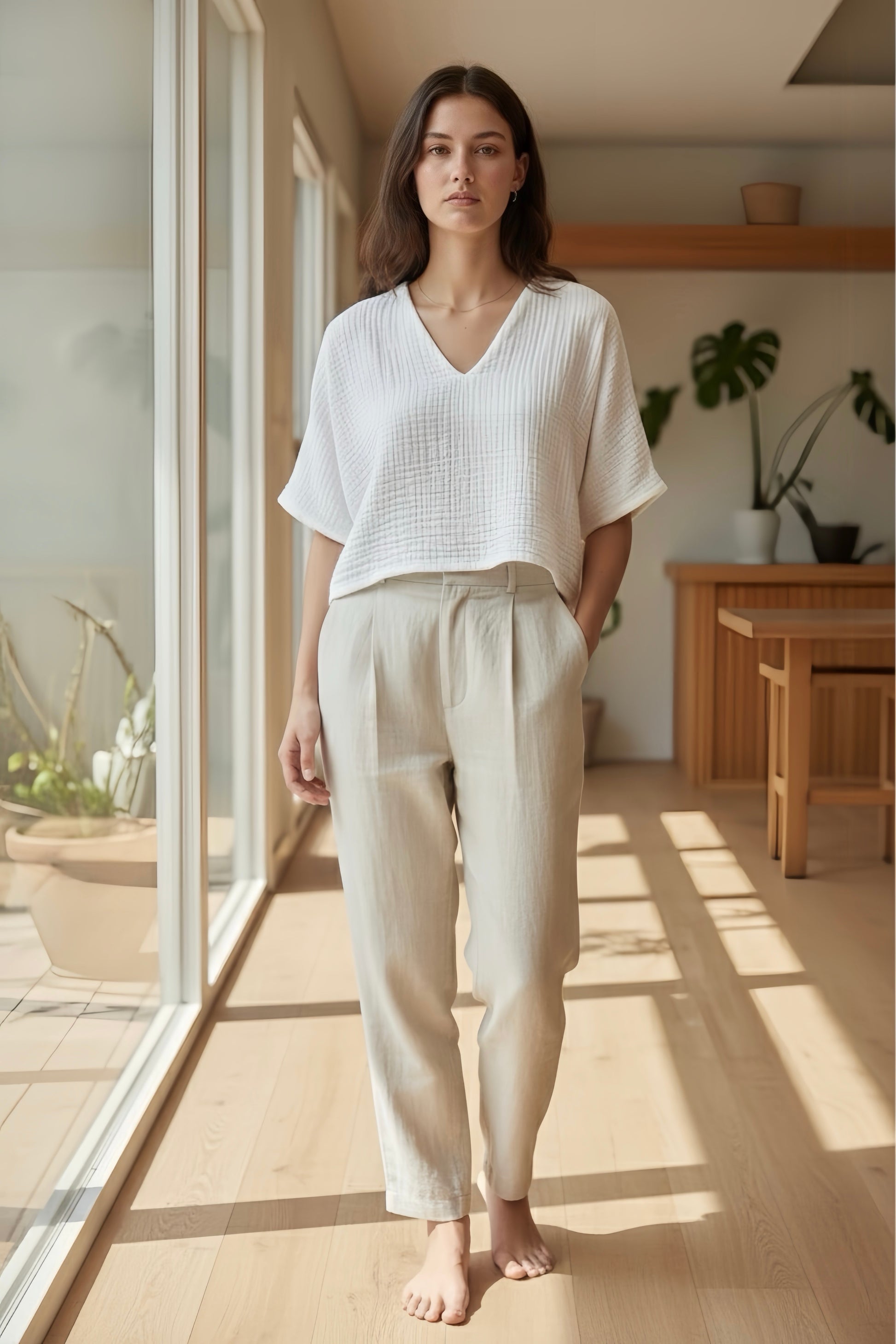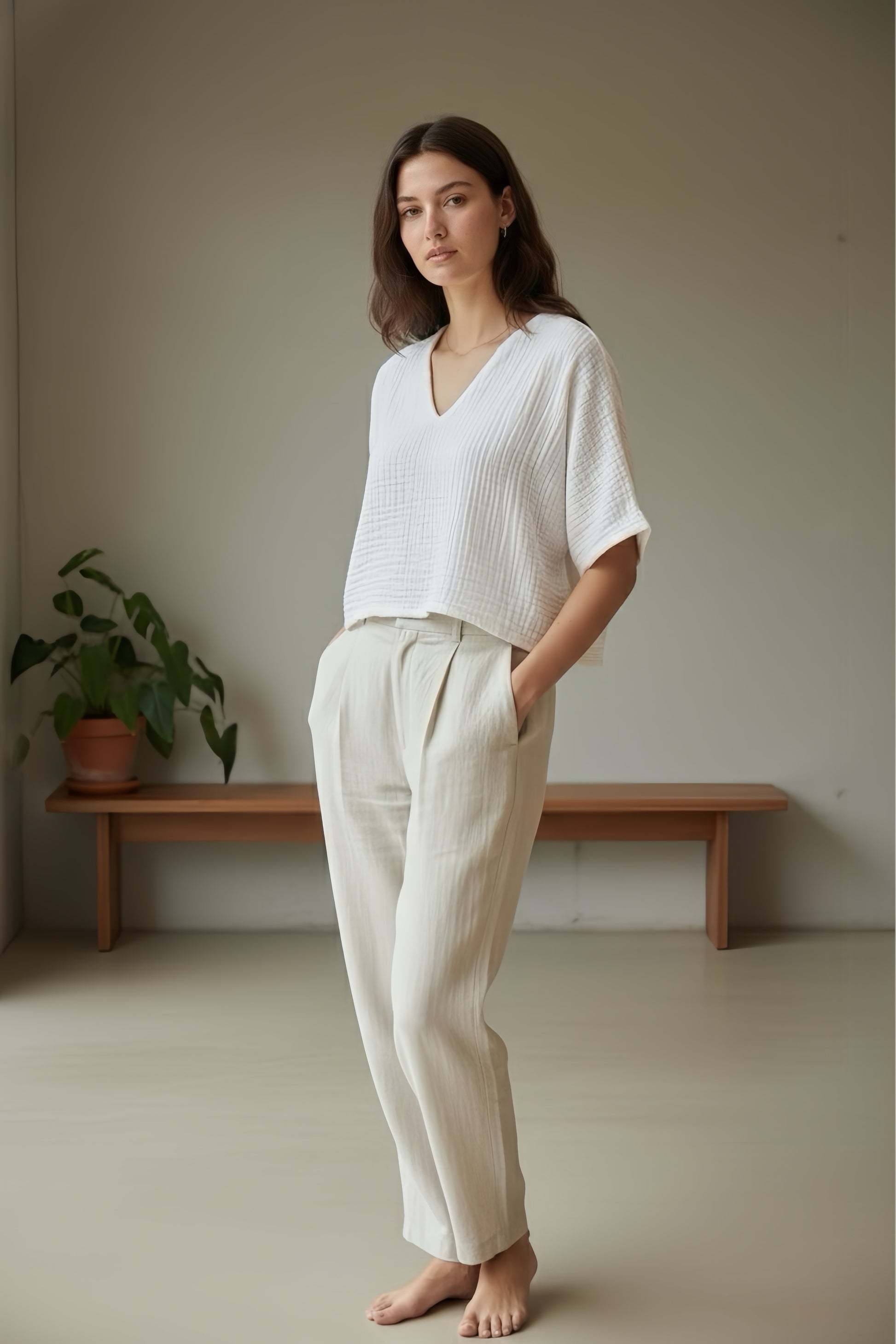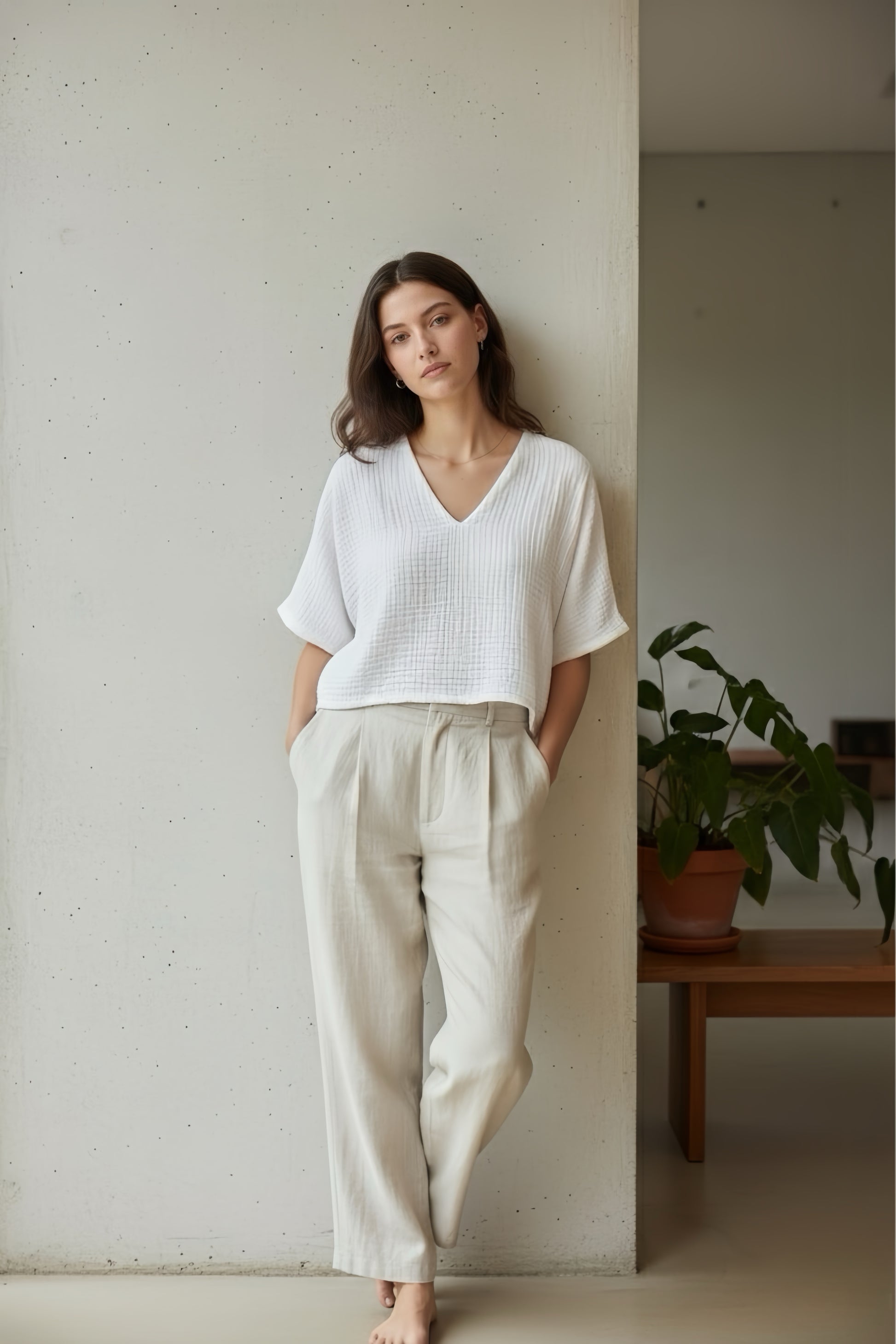 • มินิมัลในเมือง: จับคู่กับกางเกงผ้าฝ้ายทรงขาตรงหรือกางเกงลินินสีเบจ