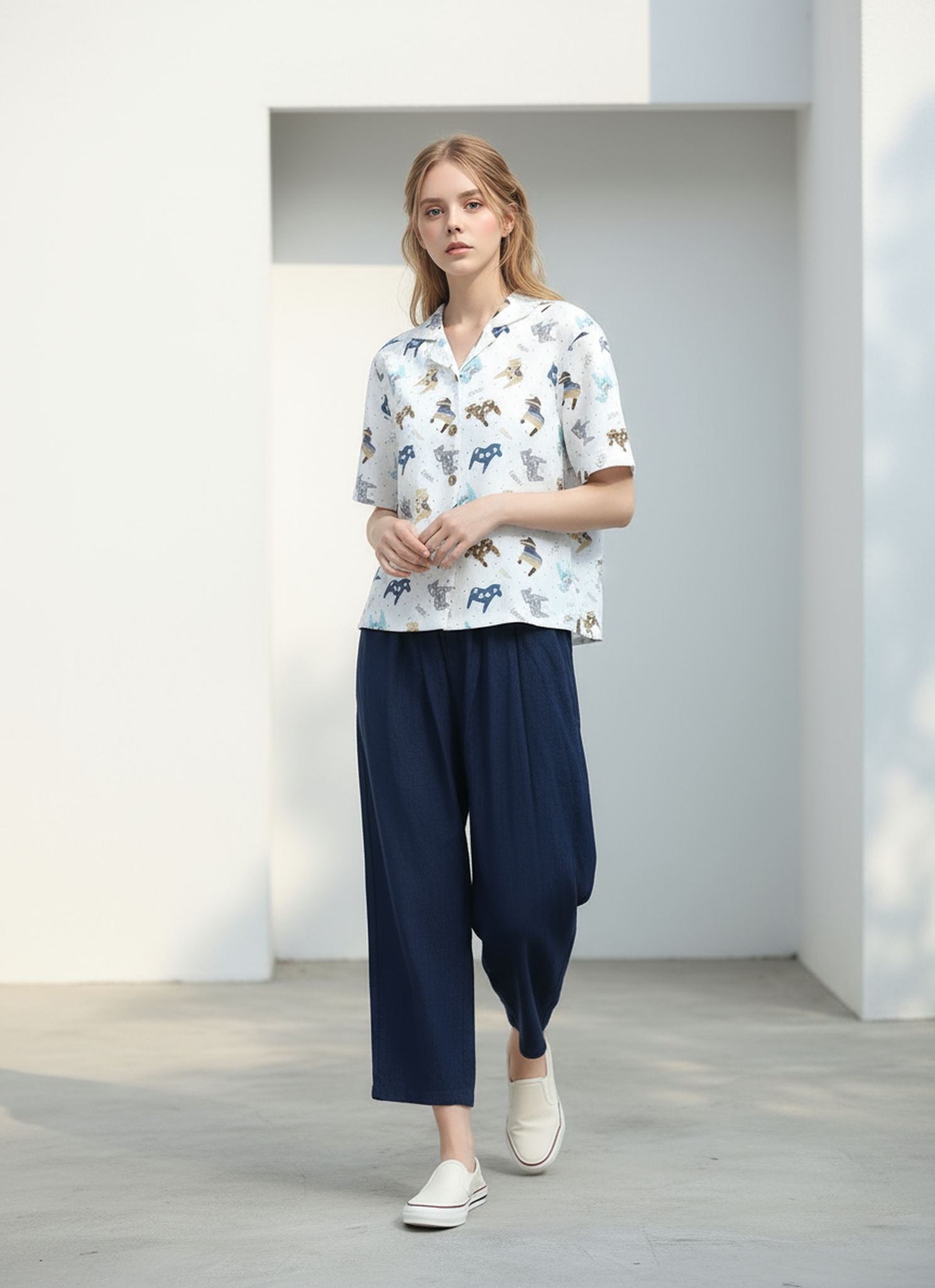 เสื้อเชิ้ตคอฮาวายทรงหลวมสบาย ที่เต็มไปด้วยความสนุกและมีชีวิตชีวาในแบบมินิมัล ตัดเย็บจากผ้าฝ้ายทอทแยง (Cotton Twill) พิมพ์ลายม้าแฮนด์ดรอว์น ลายพิมพ์เฉดน้ำเงิน เหลือง และน้ำตาลที่ผสานกันอย่างลงตัวให้กลิ่นอายวินเทจนิด ๆ แต่ยังดูร่วมสมัยและสะอาดตา
